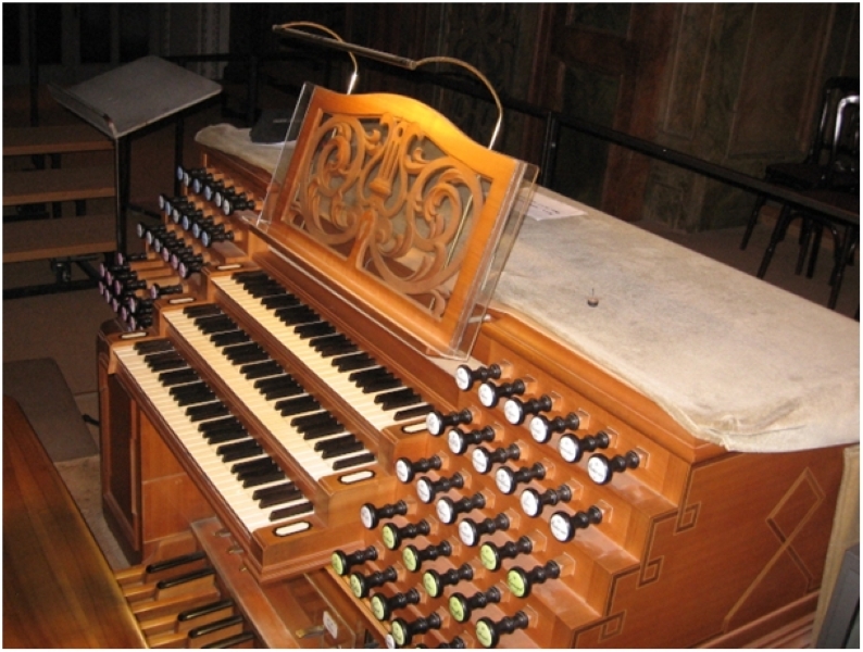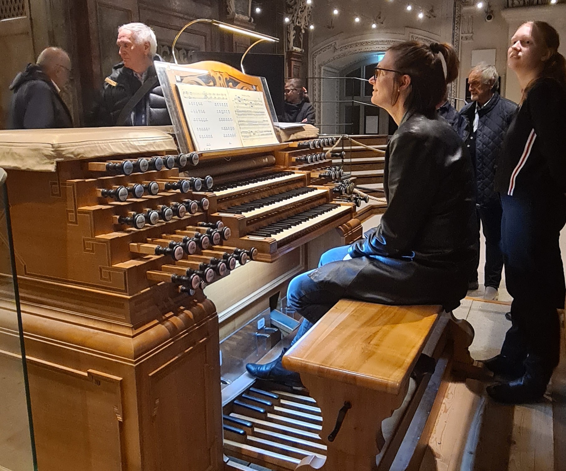Anschließend zeigte und erklärte uns Andrea Fournier die Hauptorgel „Metzler-Orgel“ und deren Spieltisch auf der Westempore. Zum Abschluss spielte sie, bei der Bedienung der Register unterstützt von ihrer Tochter Stephanie, Bachs Toccata und Fuge d-Moll (BWV 565) auf der Metzler-Orgel.