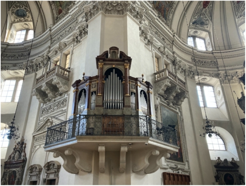 Herr Felix Kaiblinger von der Erzdiözese Salzburg ermöglichte uns eine nicht alltägliche, exklusive Führung durch den Salzburger Dom mit dem Schwerpunkt „Domorgeln“. Nach der Begrüßung durch Dr. Reinhard Gratz, Direktor des Dommuseums erklärte uns Domkapellmeisterin Andrea Fournier die Besonderheiten der sieben selbständigen, rein mechanischen, Orgeln des Doms und spielte danach gemeinsam mit ihrer Tochter Stephanie auf zwei der Orgeln auf den Pfeileremporen der Vierung. Andrea Fournier spielte dabei auf der „Hoforgel“ am südöstlichen Pfeiler, Stephanie Fournier gleichzeitig auf der „Heilig Geist Orgel“ am nordöstlichen Pfeiler. Dr. Reinhard Gratz, Direktor des Dommuseums, führte uns danach durch den Dom und erörterte dabei viele interessante Details der 1251-jährigen Geschichte dieser Kathedrale. Anschließend zeigte und erklärte uns Andrea Fournier die Hauptorgel „Metzler-Orgel“ und deren Spieltisch auf der Westempore. Zum Abschluss spielte sie, bei der Bedienung der Register unterstützt von ihrer Tochter Stephanie, Bachs Toccata und Fuge d-Moll (BWV 565) auf der Metzler-Orgel. Weitere Informationen:https://dommusik.salzburg-dom.com/