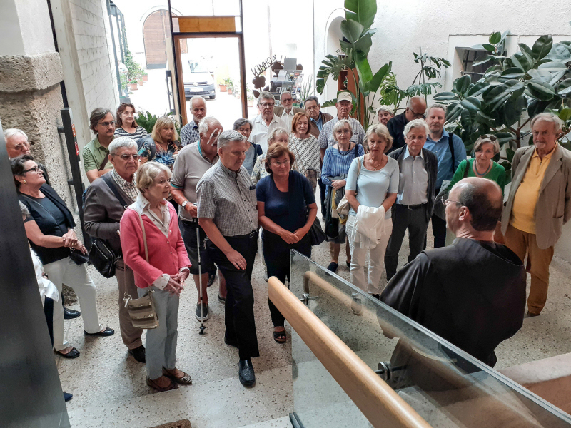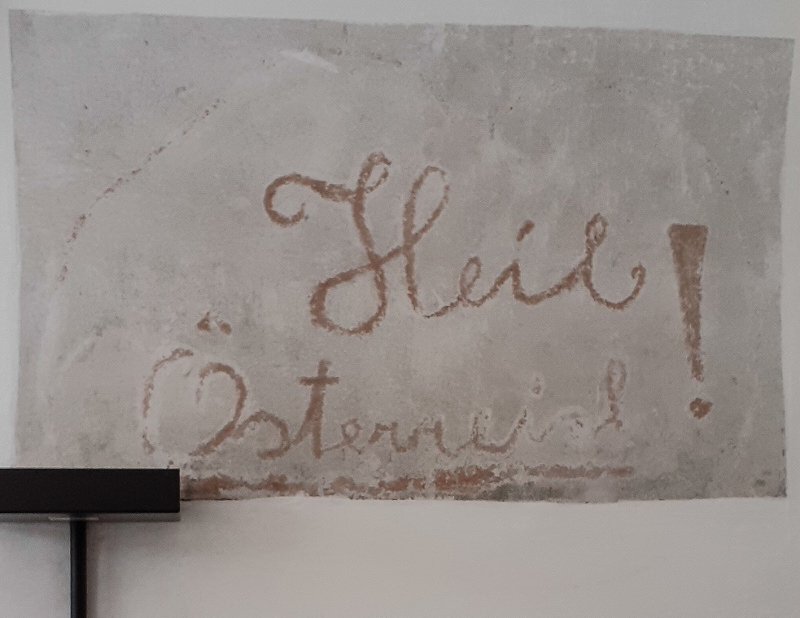 In etlichen Stationen innerhalb des Gebäudes wurde bei der Renovierung die Kulturgeschichte des Klosters anschaulich dargestellt. So sahen wir u.a. ein Zeugnis aus der Zeit der Annexion Österreichs im Jahr 1938, nämlich die Gravur „Heil Österreich“ in einer ehemaligen Garage, die die Klosterbrüder an dem Tag, als das Kloster innerhalb weniger Stunden geräumt werden musste, in die Mauer geritzt hatten.